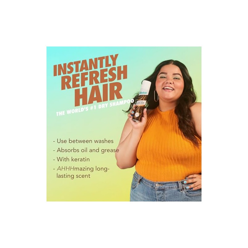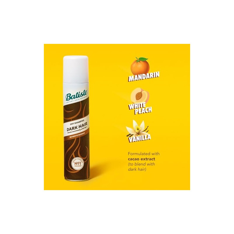 Take your hair from flat to fab with Batiste Dark Dry Shampoo. This waterless shampoo targets excess oil and grease at the roots to breathe new life into your hair, leaving you feeling clean between washes. Batiste Dark Hair Dry Shampoo is a tinted dry shampoo for brunettes, formulated with a hint of color so you can say goodbye to white residue and hello to a dry shampoo spray that blends seamlessly with your beautiful, dark hair. It also has mild notes of bergamot, white peach and vanilla bean for a pleasant scent. Batiste Dark dry shampoo is for anyone with shades on the dark hair spectrum — color treated or natural. From mahogany to chocolate to midnight black, this dry shampoo has you covered. This colored dry shampoo instantly makes your hair feel clean and fresh by removing oil, and provides added body and texture to give the appearance of fuller hair. Perfect for the girl-on-the-go, Batiste brunette dry shampoo helps save time by making styling your hair fast and easy. Let's face it, life gets crazy sometimes and skipping a wash (or two) is inevitable. Using this dry shampoo spray is easy. Shake the shampoo bottle thoroughly, section your hair and spray as much as you want 12 inches from your roots, use your fingertips to massage the Batiste shampoo into your hair and brush or style your hair however you want so you can get going. With Batiste Dry Shampoo, you can be confident your hair looks great no matter what life throws your way.