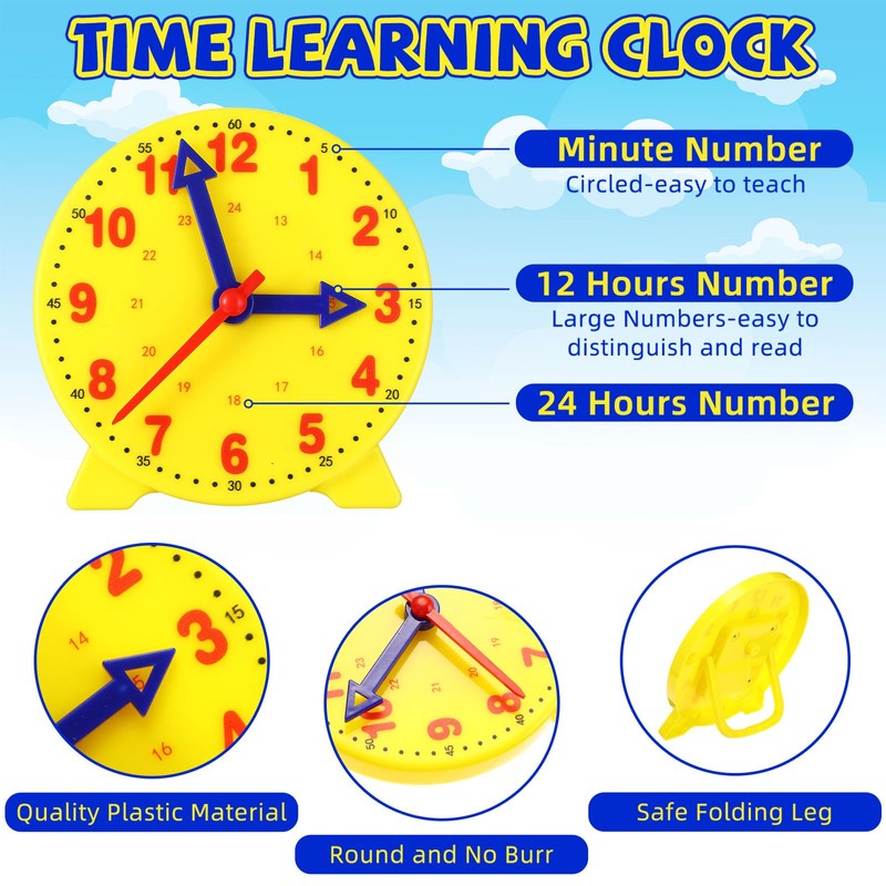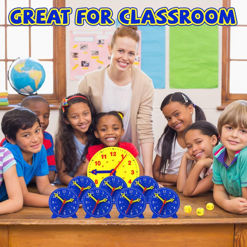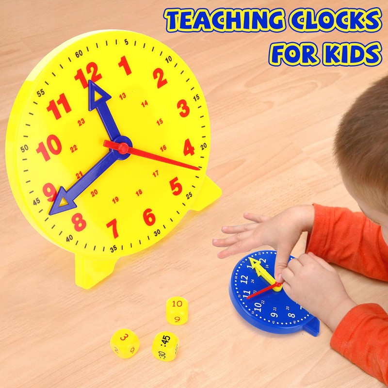 - Efficient Teaching Tool: this teaching clock set includes 1 large 10-inch yellow demonstration clock and 24 mini 4-inch blue student clocks, along with 3 time dice; Teachers can use the large clock for whole-class demonstrations, while students engage in hands-on practice with their mini clocks, enhancing classroom interaction