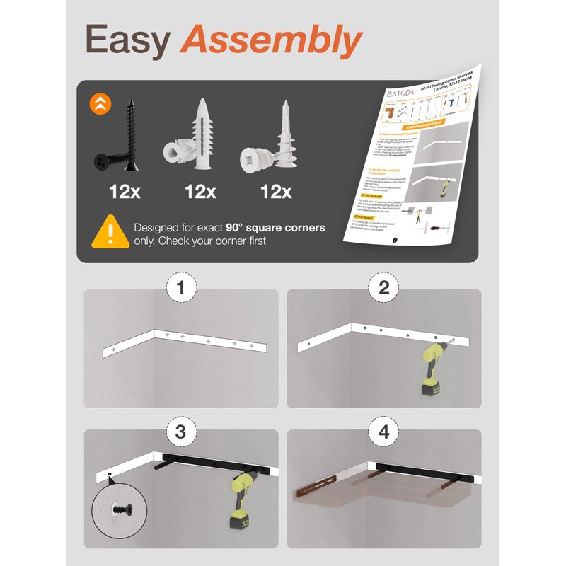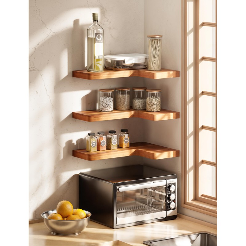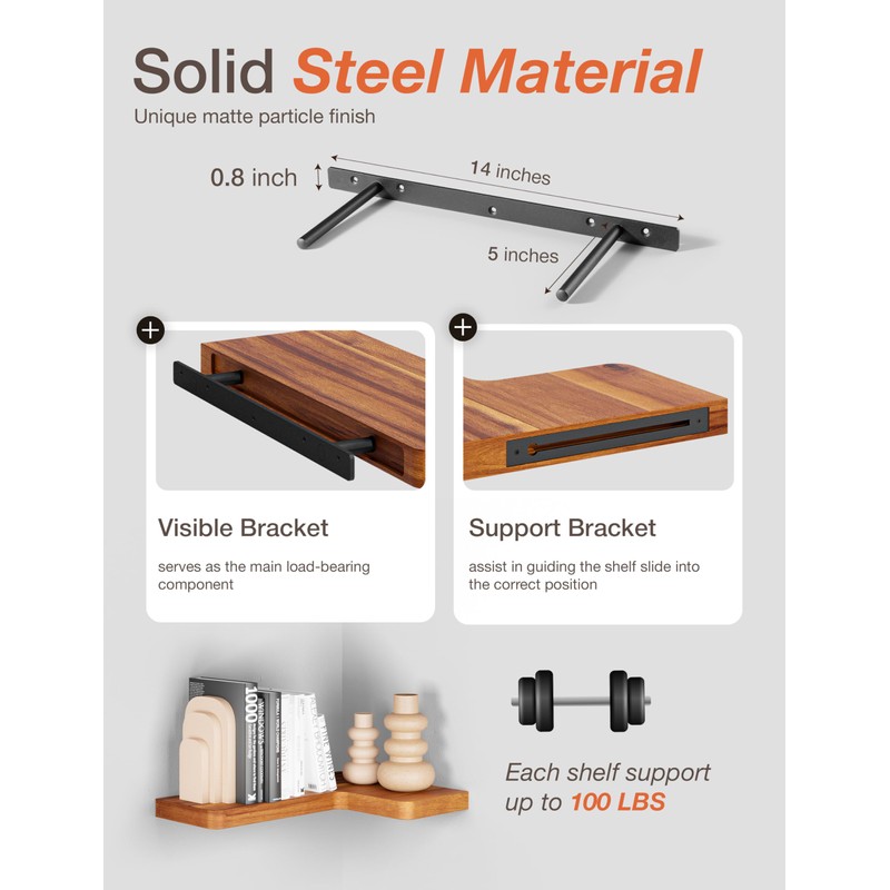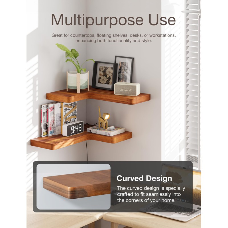 BATODA Acacia Wood Corner Floating Shelves 17" x 12"– Corner Shelf Wall Mounted - Floating Book Shelves for Wall - Brackets and Shelving Hardware Included for Kitchen, Living Room, Bathroom (Set 2)