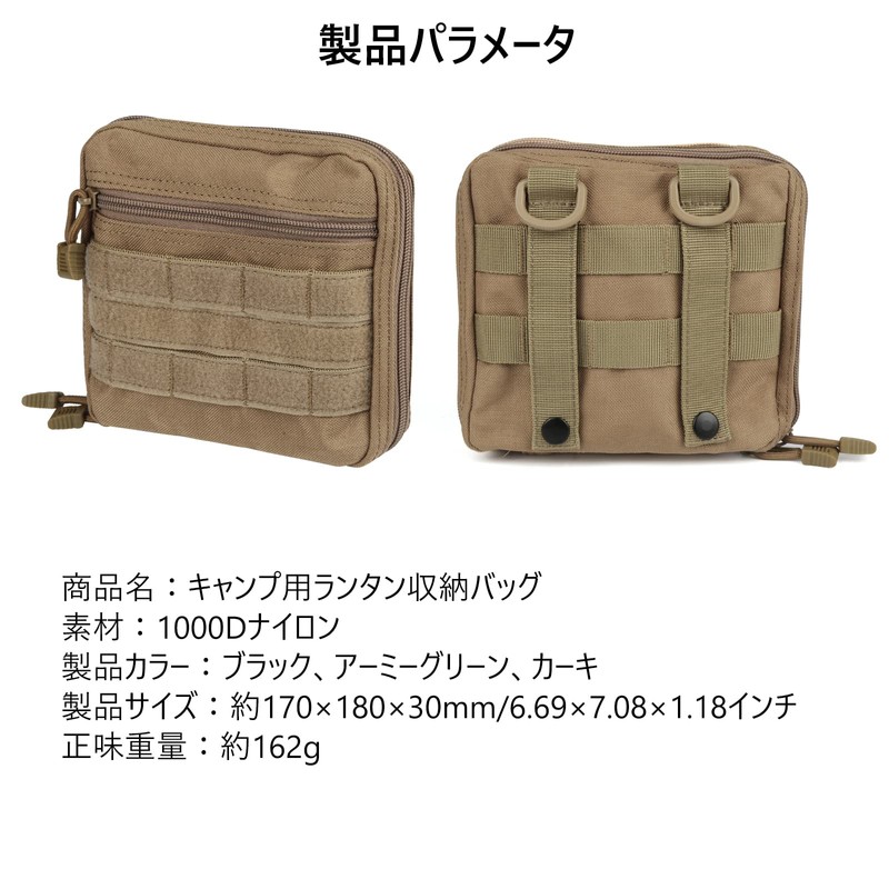 - LED Lantern Storage Bag Specifications: Color: Black/Military Green/Khaki, Product Material: Nylon, Product Size: 6.7 x 7.1 x 1.2 inches (170 x 180 x 30 mm), Product Weight: Approx. 5.6 oz (162 g). The factory is strictly controlled, beautiful and durable, lightweight and easy to carry