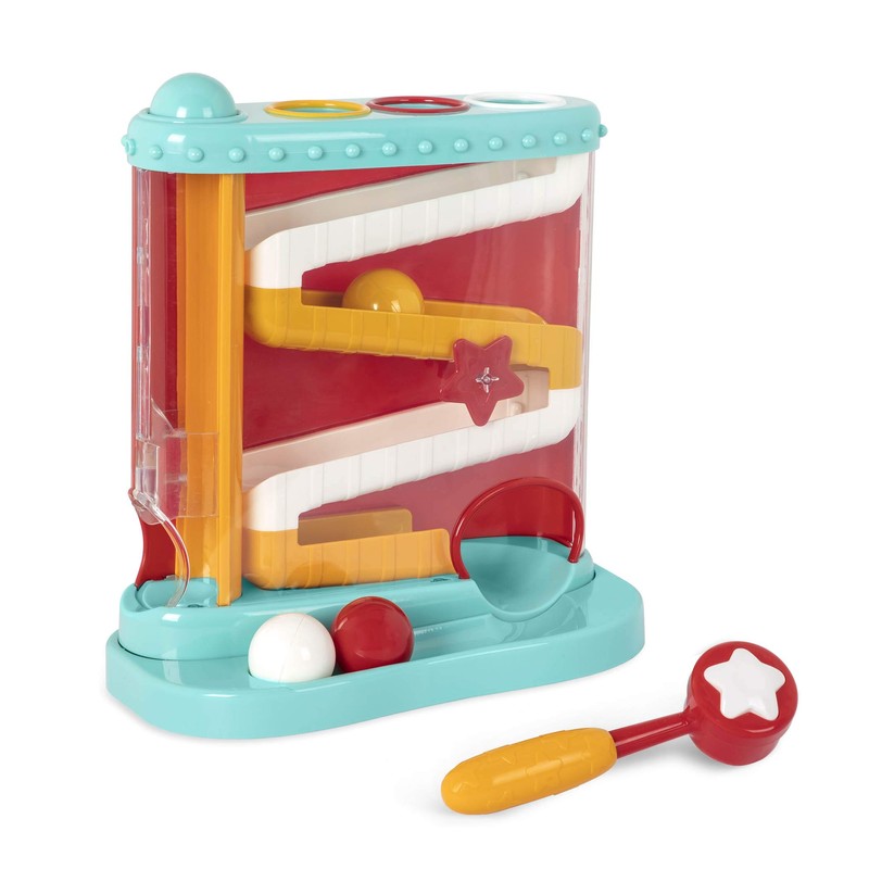 The pound & roll from Battat is sure to keep little ones busy for hours! have a ball with 4 colorful balls, 1 tower toy station, and 1 hammer toy! Place the balls in their color-coded sockets… and whack! See them roll down! See the little red Star spin as the balls make their way down! A sturdy ball and hammer toy tower with a detachable base to collect the balls when they exit the maze. Remove the base to have the balls roll randomly across the room! Perfect to get little ones crawling, toddling and moving. A cause-and- effect masterpiece, The Battat pound & roll is made of sturdy, durable and worry-free materials. Build strong motor skills, and spend hours of rewarding and educational play with this interactive baby activity center. Ready, set, whack!