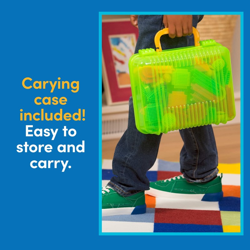 Build, create and play with Battat Bristle blocks. this set of Battat Bristle blocks comes with 85 building blocks and a carry case. This is one of the best building sets for kids of all ages. The large pieces are easy to grab and fit perfectly in a toddler's hand, while the design is unique and funky enough to get older kids to create their own elaborate masterpiece. Have little ones use their imagination to build and rebuild beautiful 3D sculptures. providing hours of creative play, these plastic building blocks feature soft interlocking bristles that connect together at any angle; perfect for little hands (or even a little massage). all Bristle blocks playsets are compatible with b. Toys’ spinaroos and stackable. combine Bristle blocks sets together to create even bigger builds! Recommended for 2+.