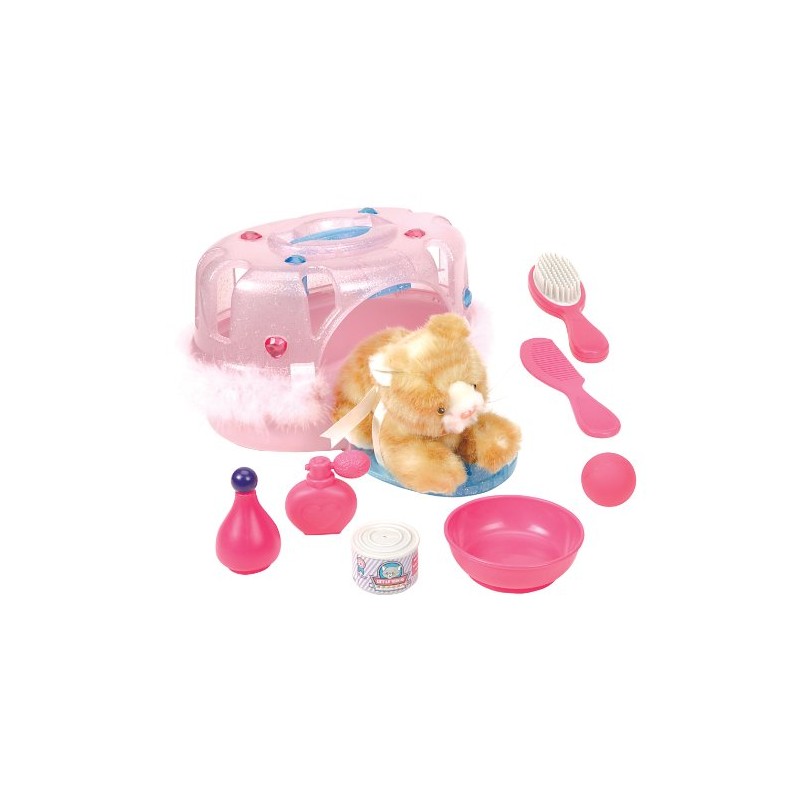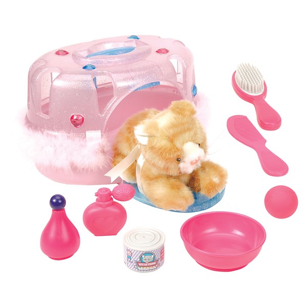 - This set includes one toy kitten, a comb, can of food, bowl, perfume bottle and shampoo bottle, plus a pink travel cage.