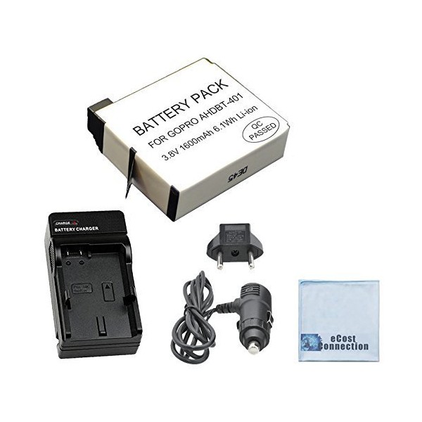 Battery for GoPro HERO4 Silver and Black Edition, 1600 mAh + Home/Car Charger + eCostConnection Microfiber Cloth, AHDBT-401
