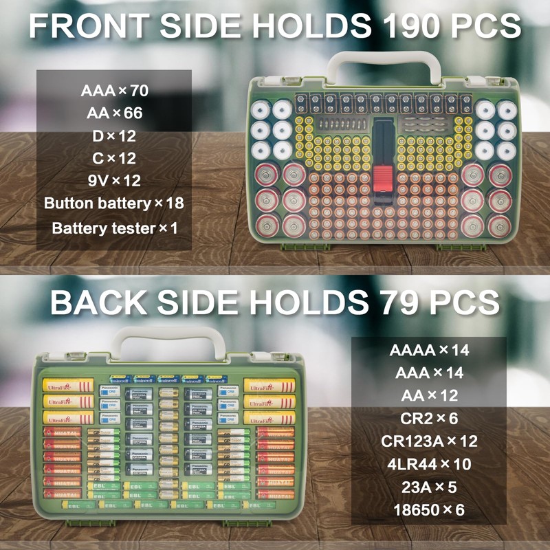 - Double-layer large-capacity battery storage organizer: Battery holder for 269 pcs batteries. Various different sizes groove on the two sides of the battery storage holder, and one layer with model identification. Battery case is easy to insert and remove. Battery vault box for 66*AA, 84*AAA, 14*AAAA, 12*9V, 12*C, 12*D, 6*18650, 12*CR123A, 10*4LR44, 6*CR2, 18*3V lithium cell batteries. Battery caddy fits for Energizer Alkaline/ for ACDelco/ for Panasonic. (Batteries not includes)