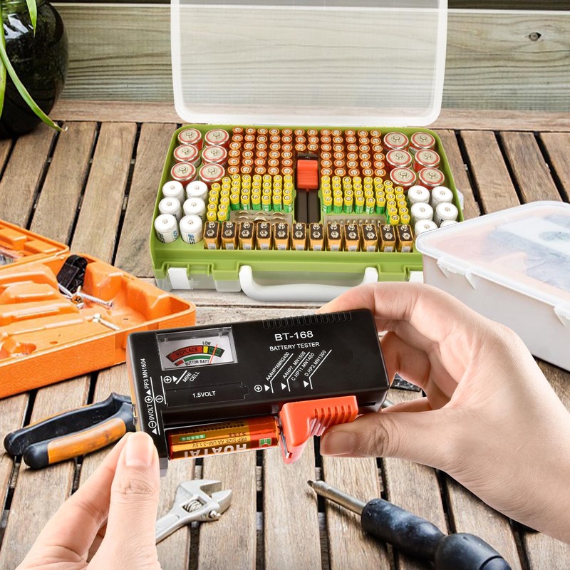 <p>If you're bothered by batteries rolling around or cluttering your drawer, you need our battery box organizer. Battery storage container neatly store batteries, and garage organization meet the different needs and save storage space. When you need batteries, it's there. AA batteries case compatible with Amazon Basics/ for Energizer/ for ACDelco/ for Panasonic/ for Tenergy Batteries.</p> <p></p> <p>Q&A</p> <p>What material is for deluxe battery organizer made of?</p> <p>Thickened premium plastic, not easily broken, keep your batteries well.</p> <p></p> <p>Battery box is full of batteries, can the cover still be closed?</p> <p>The inner groove of battery checker organizer has a specific battery position for each size, it can easily close the cover even when the battery is fully charged. And doesn't drop anything even when upside down.</p> <p></p> <p>When carrying or moving the batteries organizer by the handle, does batteries stay in place?</p> <p>The grooves in battery holder are custom sized to fit batteries, just make sure the latches are closed when moving and they won't move around.</p> <p></p> <p>Can it be wall mounted? Only in a drawer?</p> <p>The 9v battery box can be placed in a drawer or on a table, because it has a stable base and can be placed upright, saving space. If you have sturdy hooks or nails, you can try choosing a wall mount.</p> <p></p> <p>If all aa and aaa rows are full, where do you store them?</p> <p>There is a removable foam card slot area inside battery holder case with tester. Remove the foam slot and put in other smaller types of batteries.</p> <p></p> <p>Products include:</p> <p>1* Battery container</p> <p>1* Battery tester</p> <p>(Bateries not included)</p>