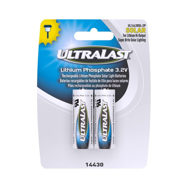 Do you have solar lights that use 3.2-volt lithium phosphate rechargeable batteries? This pack of UL14430SL-2P 14430 Lithium Batteries for Solar Lighting from Ultralast is just what you need. These are only to be used in high output super bright solar lights that use 3.2 volt 400 mAh batteries. They meets or exceeds original manufacturer specifications. 3.2V. Long-lasting. 400mAh. LiFePO4 (Lithium Iron Phosphate). For lithium high-output, super-bright solar lights. Rechargeable. Carded.