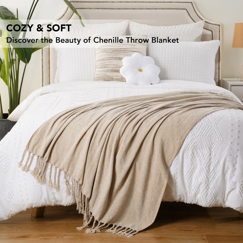 BATTILO HOME Chenille Throw Blanket for Couch, Soft Warm Cozy Knitted Throw Blanket with Tassels, Lightweight Chenille Knit Throw Blanket Suitable All Season(50"x60",Beige)