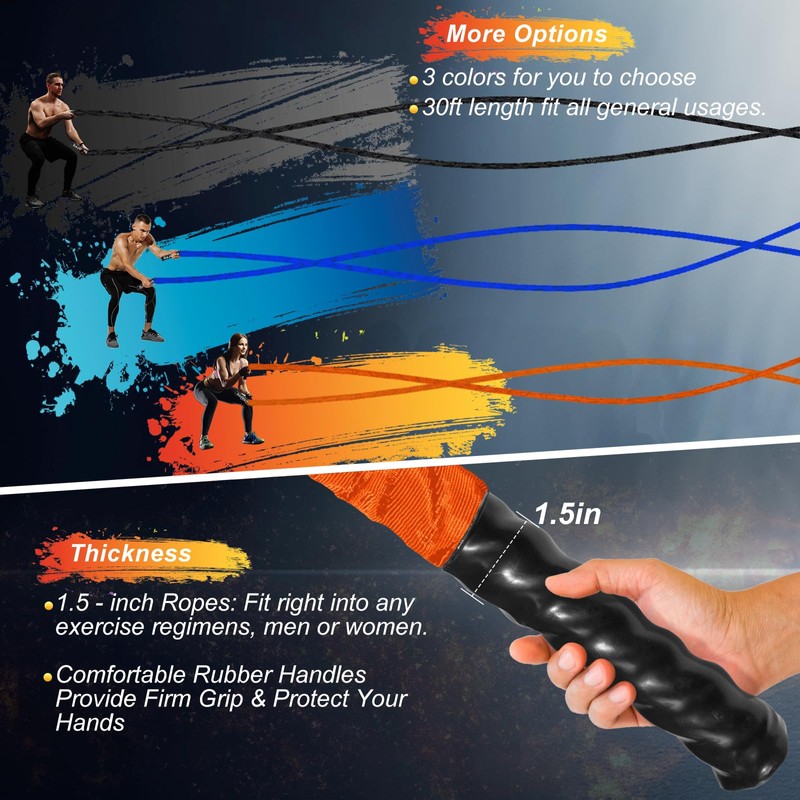 - Battle Rope with Durable Polyester Filament Material: An extra protective cover is added to the outer layer, the battle rope is an ideal choice for beginners and serious fitness enthusiasts for home gym and outdoor exercise. The comfortable coated handle protects your hands and provides a firm grip for all your training and exercises. High tensile strength exercise rope prevents breaking, abrasion, or loosening