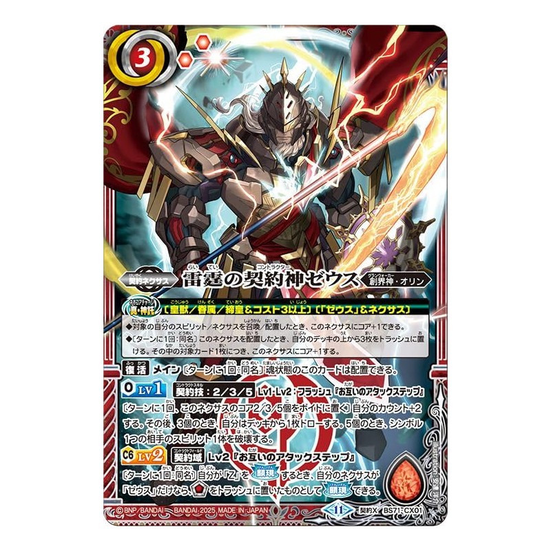 - ★Battle Spirits Contract Edition: Chapter 4 "Return of the God King" (BS71) Recorded ■Card Name: The ThunderboltContractor Zeus ■Rarity: Contract X Rare ■Types: Contract Nexus ■Cost: 3/Relief Symbol: 2/Red/Faith/Olympin ■Lv Cost: (0) Lv Cost 1 (C6) Lv2