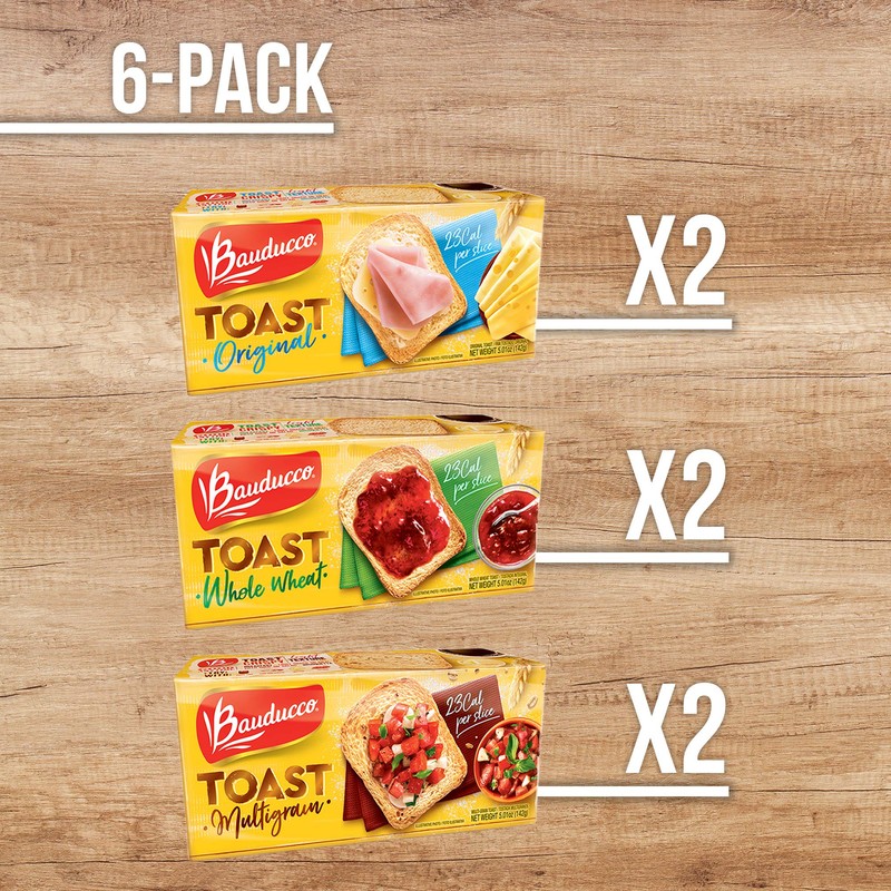 - CONVENIENT 6 PACKS COMBO: It contains 6 packs of 3 delicious Bauducco toast ready to eat: 2 Original, 2 Whole Wheat and 2 Multigrain. Bauducco Toasts will satisfy each of your family’s personal tastes.