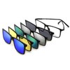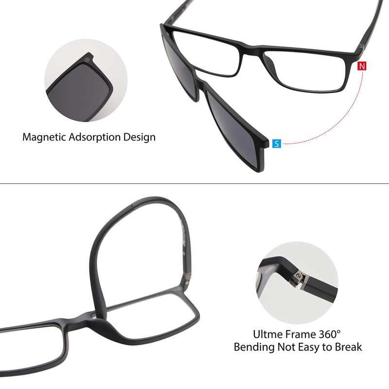 - Package Contains: Pls purchase it as instruction. The Five in one clip on sunglasses set includes 1 pair of magnetic glasses frame + 5 pair of magnetic lenses + 1 pcs glasses case; This five-in-one lens can only be used with this frame, not with other frames.