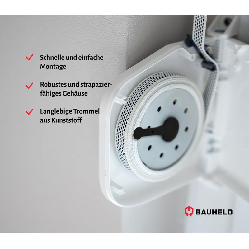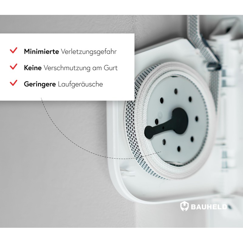 - Safe installation – thanks to the intelligent plastic drum, you benefit from a reduced risk of injury compared to sharp-edged models made of metal when installing the belt winder. Lower running noise also characterise the drum