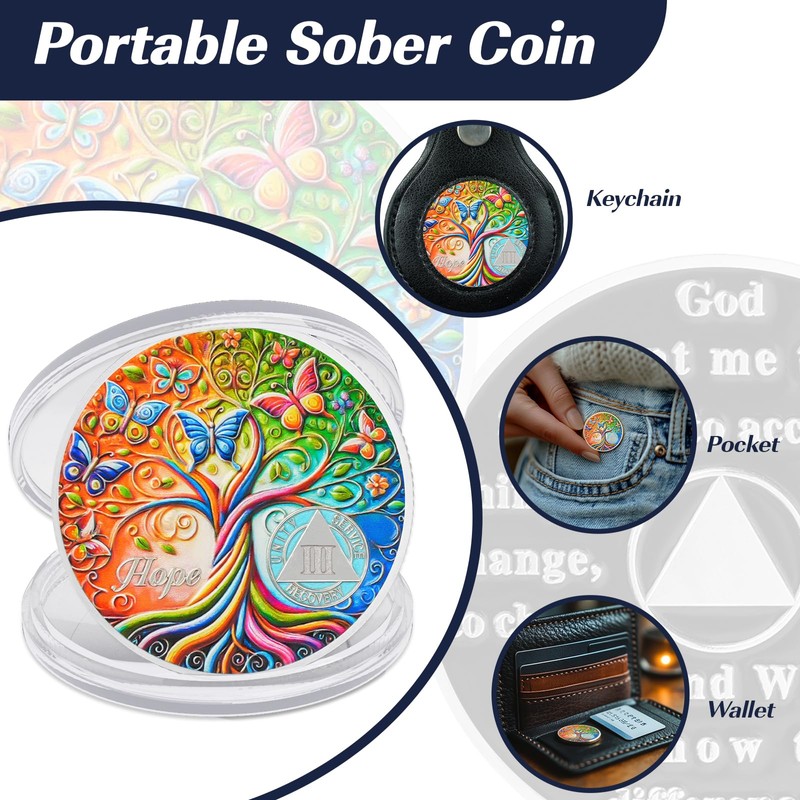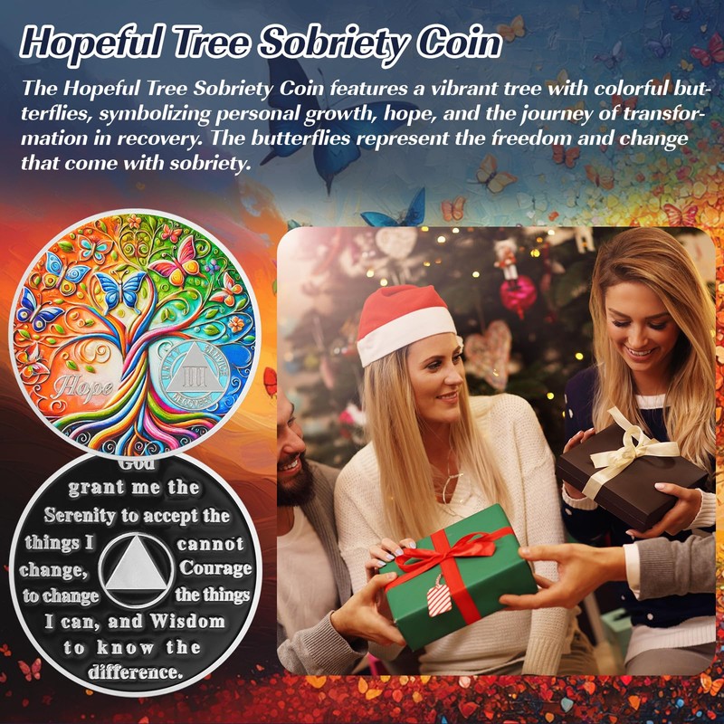 - Symbol der Hoffnung & Veränderung: Die "Baum der Hoffnung" Nüchternheitsmünze zeigt einen kunstvoll gestalteten Baum mit lebendigen Ästen und flatternden Schmetterlingen, die persönliches Wachstum und Transformation symbolisieren. Die starken Wurzeln und ausgedehnten Äste repräsentieren den Genesungsprozess, während die Schmetterlinge für Freiheit, Neuanfang und das Potenzial einer besseren Zukunft stehen. Diese Münze erinnert täglich an Stärke, Hoffnung und den Weg der Genesung