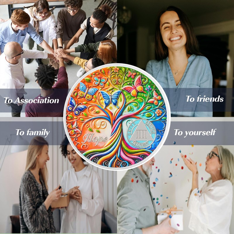 - Symbol der Hoffnung & Veränderung: Die "Baum der Hoffnung" Nüchternheitsmünze zeigt einen kunstvoll gestalteten Baum mit lebendigen Ästen und flatternden Schmetterlingen, die persönliches Wachstum und Transformation symbolisieren. Die starken Wurzeln und ausgedehnten Äste repräsentieren den Genesungsprozess, während die Schmetterlinge für Freiheit, Neuanfang und das Potenzial einer besseren Zukunft stehen. Diese Münze erinnert täglich an Stärke, Hoffnung und den Weg der Genesung