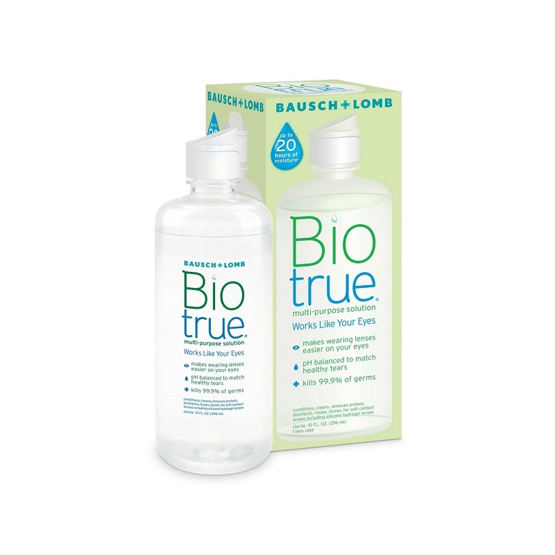 Biotrue is a multipurpose solution, inspired by the biology of your eyes (Bio True). Designed to work like your eyes. By studying how the eye works naturally to cleanse, hydrate and stay healthy, Bausch + Lomb has developed a unique and innovative solution to provide excellent care for contact lenses.