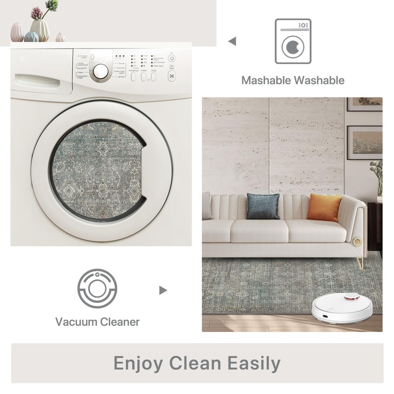 - Effortless Maintenance: Appreciate the ease of care with our machine washable rug, engineered to withstand laundering without shedding or deteriorating. Regular vacuuming and spot cleaning keep it fresh, while colors remain lively and fade-resistant. The low pile height is also compatible with robotic cleaners.