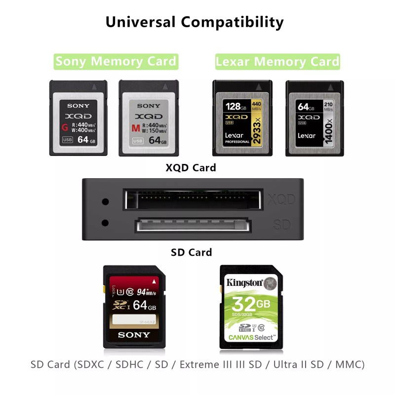 ✔️Universal Compatibility:It supports memory cards such as XQD card (Sony G/M series USB mark xqd cards, Lexar 2933x Lexar 1400x USB mark xqd cards) and SD card (SDXC / SDHC / SD / Extreme III III SD / Ultra II SD / MMC).Allowing you to read and write on 2 cards simultaneously. Greatly save your time.
