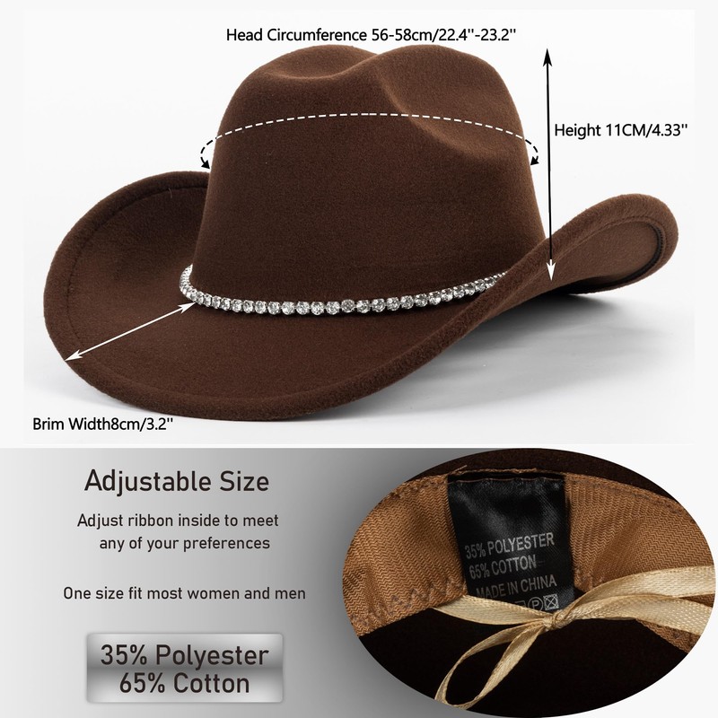 - Premium Felt Fabric: Our cowboy hat, made from 65% cotton and 35% polyester, offers lightweight, breathable comfort for all-day wear. To restore any wrinkles, simply steam above a hot pot and gently reshape (avoid direct contact with the steam iron)