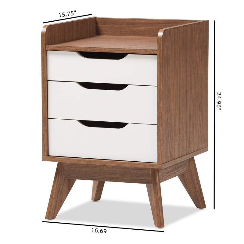 Baxton Studio Maddy Mid-Century Modern Wood 3-Drawer Storage Nightstand, White/Walnut Brown