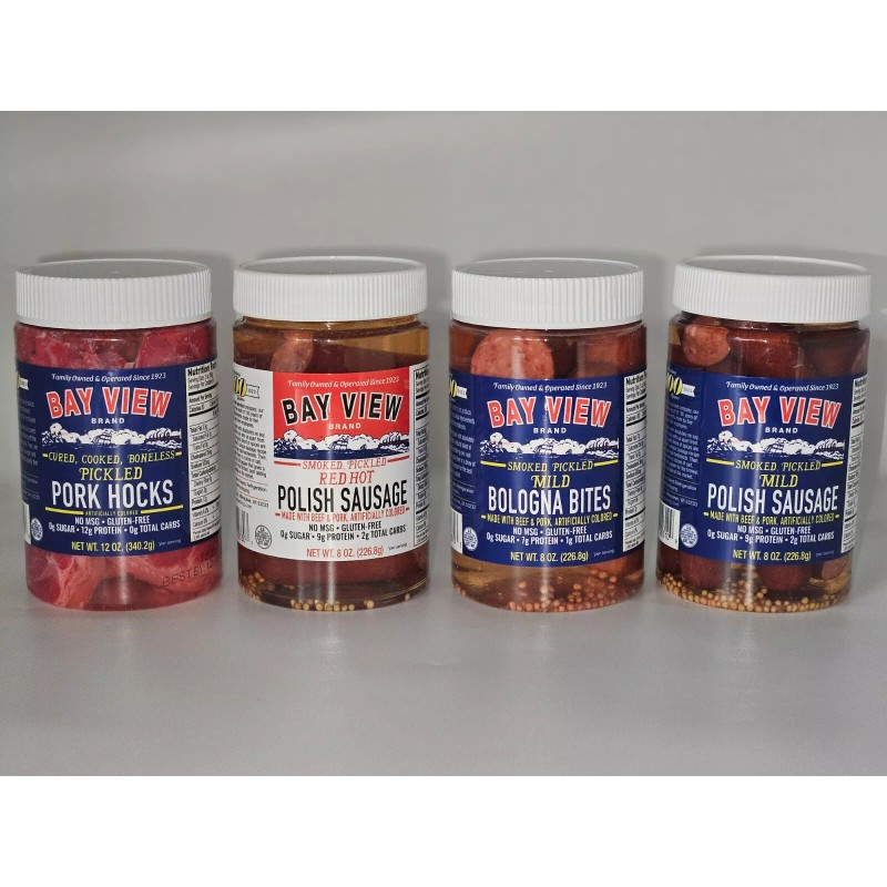 The Pickled Meat Sampler Pack from Bay View Packing Company consist of fresh quality meats and a unique blend of spices to give it that good old fashioned tavern style flavor. This assures quality for your enjoyment. This meat Sampler Pack comes in a variety pack of 4 types listed below. No refrigeration needed before or after opening. These meat products are a tasty snack or side dish for your holiday meal.