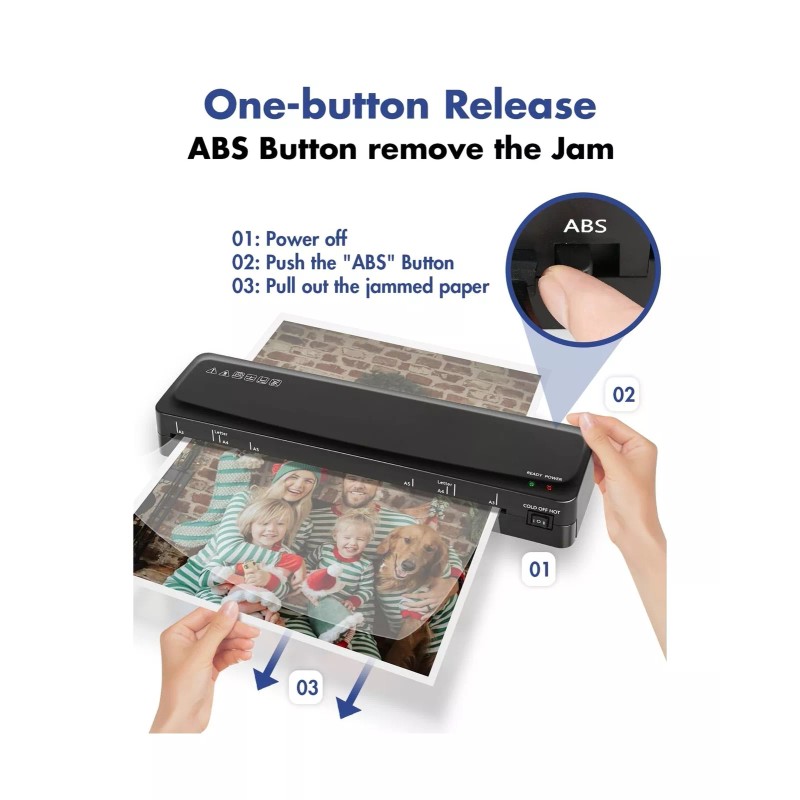 - 2 Roller System & ABS Release Jam This laminator machine upgraded 2 Roller system ensures high-quality lamination. It prevents wrinkling, bubbling, preserving and protecting your documents. The ABS button for efficient and convenient resolution of paper jams.Just keep pushing the ABS button to release the stuck pouch.