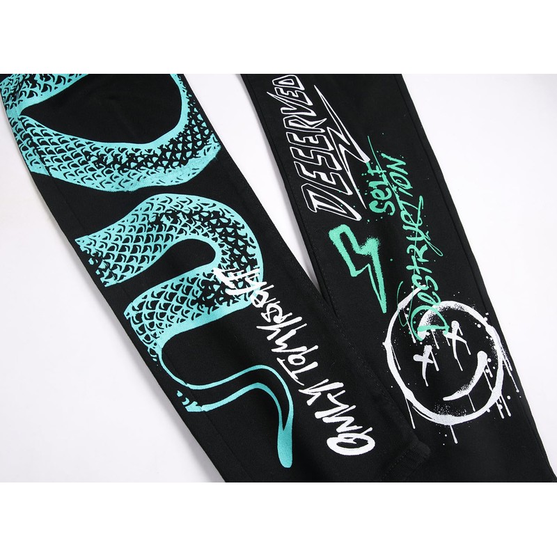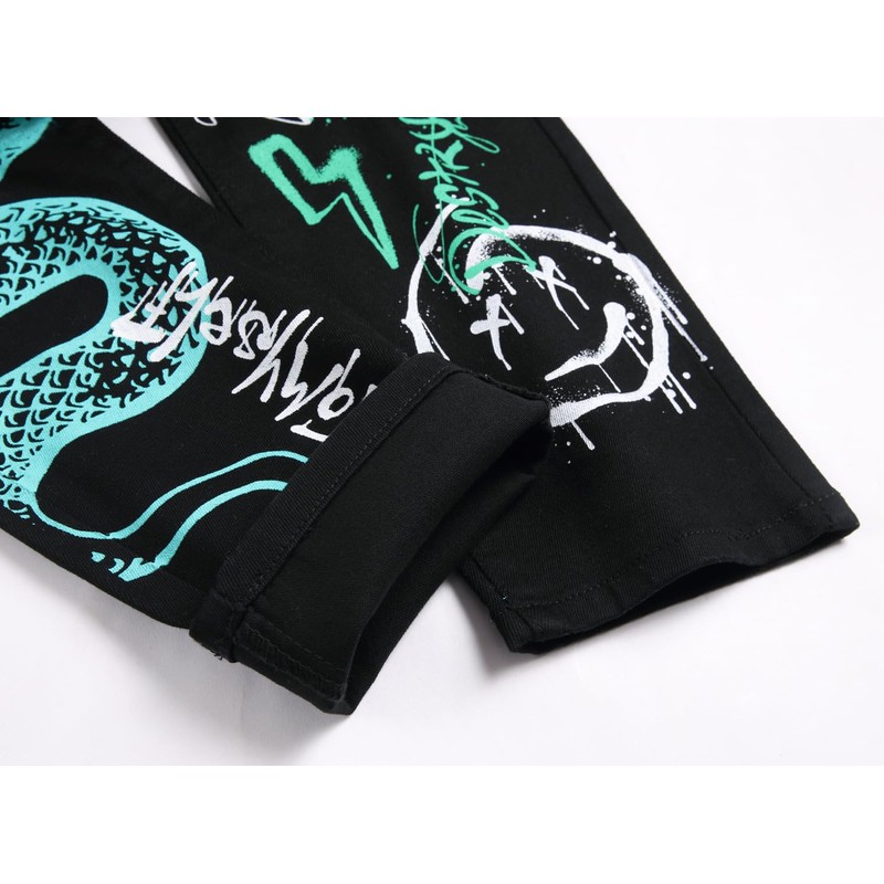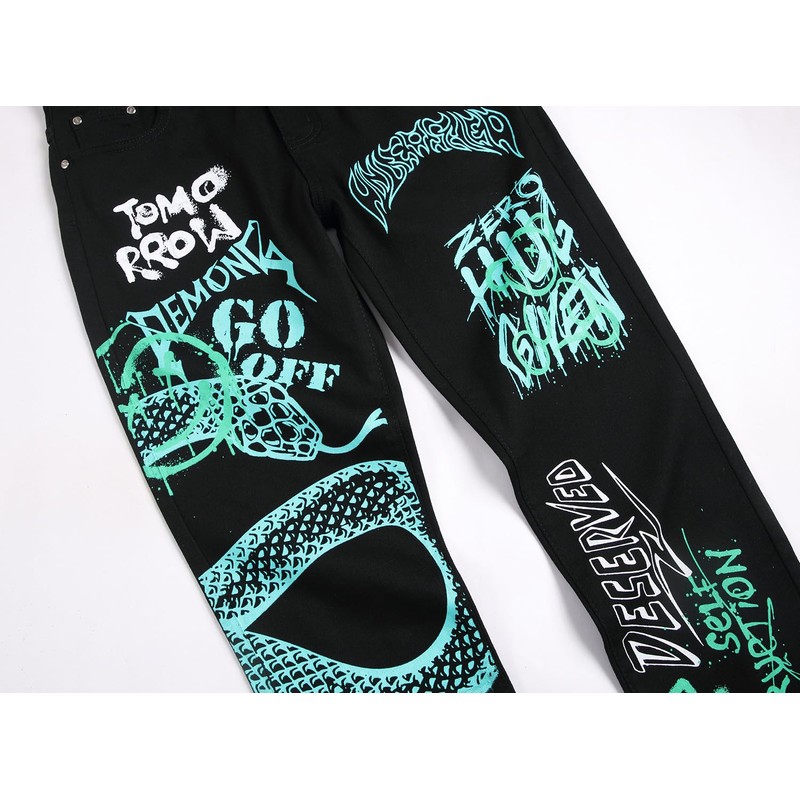 Baylvn Men's Punk Style Letter Pattern Green Snake Printed Jeans Pants,5705 Black,Size 32