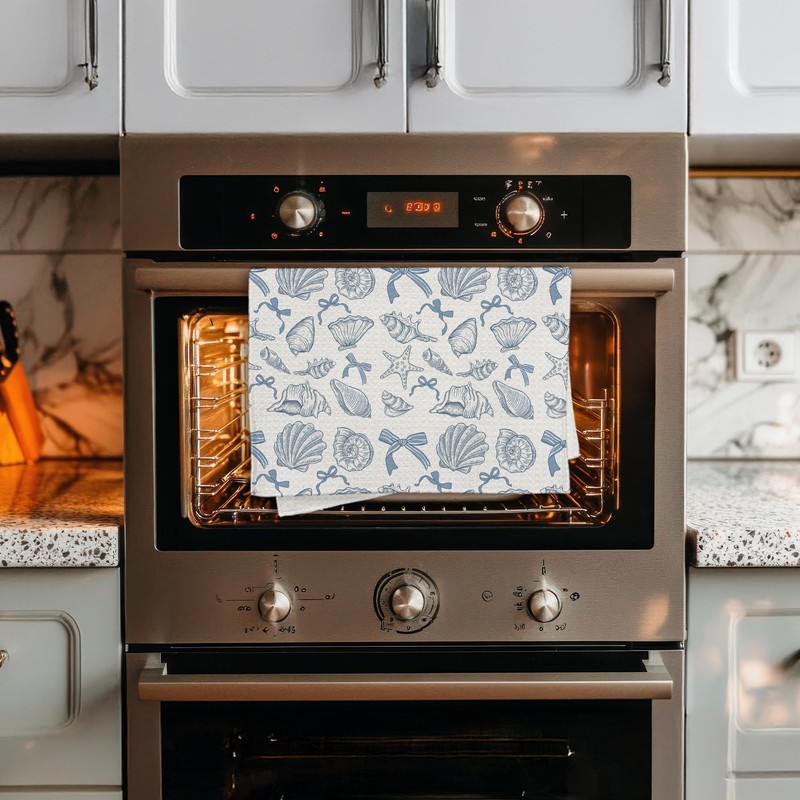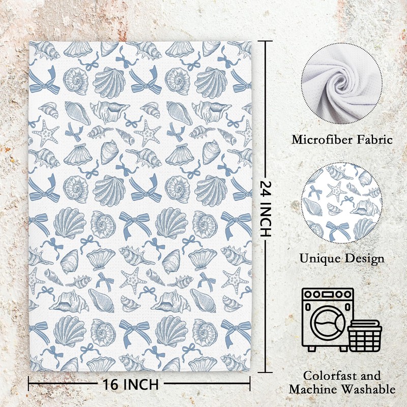 BAYOGITA Blue Coquette Bow Seashell Beach Kitchen Towels Decorative, Preppy Blue Beach Dish Tea Towels for Kitchen Drying, Coastal Nautical Beachy Hand Towels for Bathroom Decor, 16x24 Inch