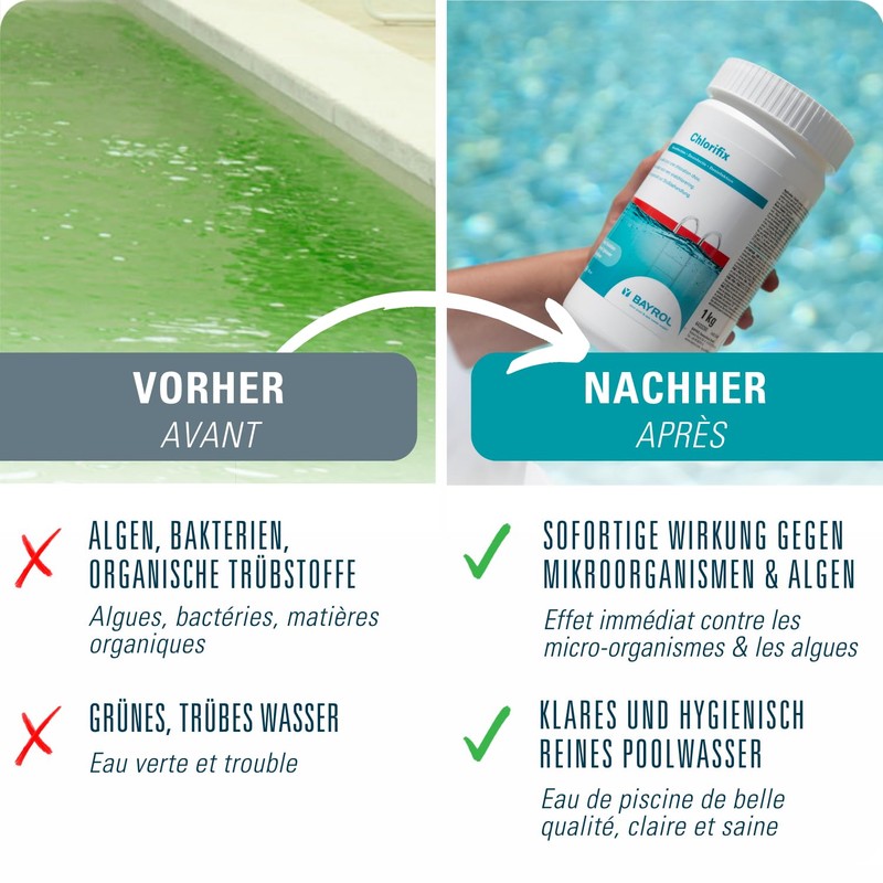 - CHLOR POOL: Chlorifix gibt nach Zugabe ins Wasser eine große Menge Aktivchlor frei - Mikroorganismen & Algen werden oxidiert - Das Chlor Pulver macht nach wenigen Stunden das Wasser klar & rein