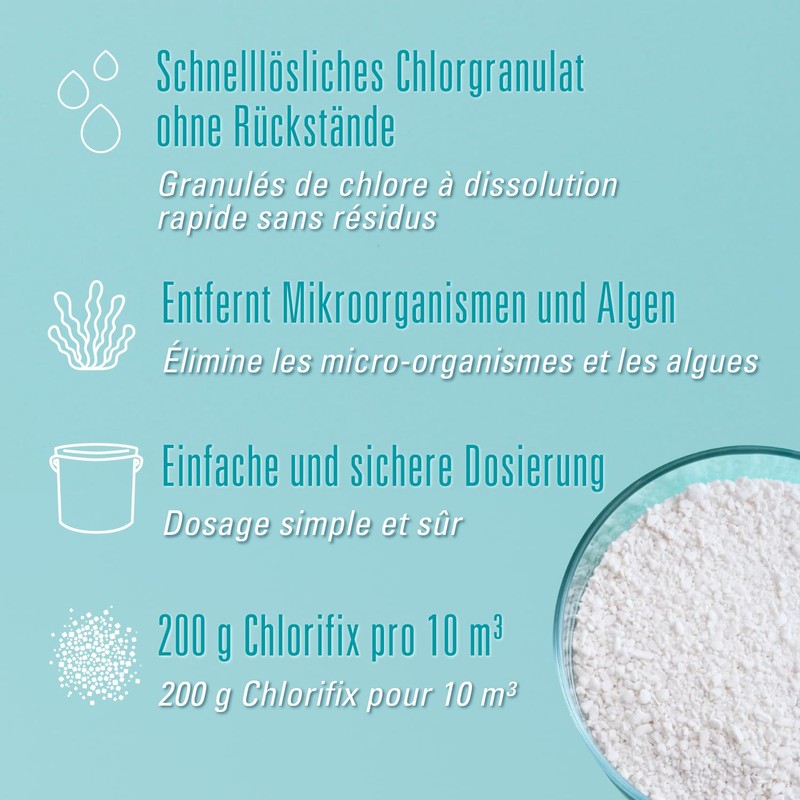 - EINFACHE DOSIERUNG: Bei Wasserproblemen, trübes Wasser, Algen im Pool, 200 g Chlorifix pro 10 m³ bei laufender Umwälzpumpe direkt ins Wasser zugeben - am besten abends nach dem Badebetrieb