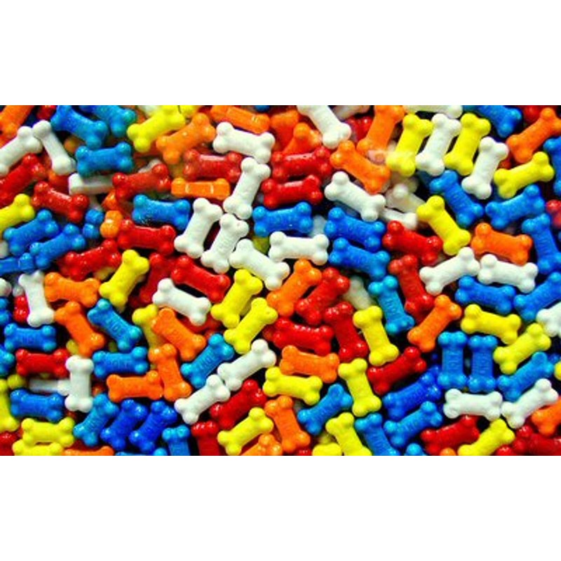 - Assorted dog bone shaped candy. Assorted colors of blue, orange, white, and yellow