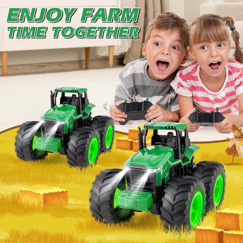 - Funny Light Up Monster Truck--The monster track lightning wheels tractor toy with heavy-duty tires has great strength and stability for all kinds of rough terrain, carpets and sandboxes. Kids can use the remote control to make the vehicle roll 360 degrees and press the light-up button to bring this monster truck toy to life and inspire your off-road adventure ideas. This fun toy can inspire your kid's imagination while learning about farming. Your child can create their own farm-the possibilities are endless. This tractor toy set is an ideal remote control learning toy for toddlers and kids.