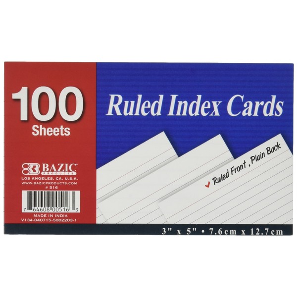 BAZIC 100 Count 3 inches by 5 inches Ruled White Index Card