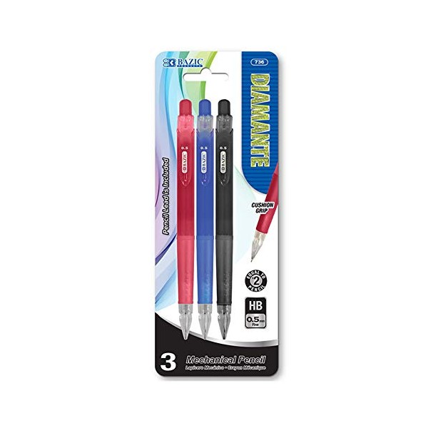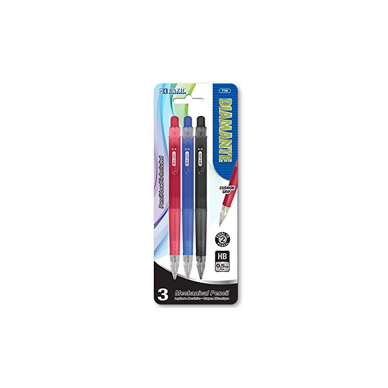 BAZIC Mechanical Pencil 0.5mm Diamante, Soft Grip Latex Free Eraser, Smooth Writing Pencils Lead for Drafting Drawing Sketching (3/Pack), 1-Pack