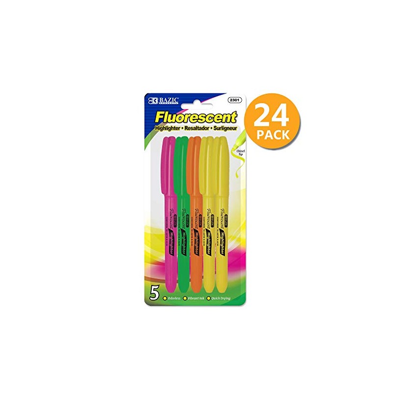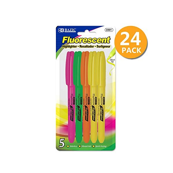 BAZIC Pen Style Fluorescent Highlighter w/Pocket Clip (5/Pack)