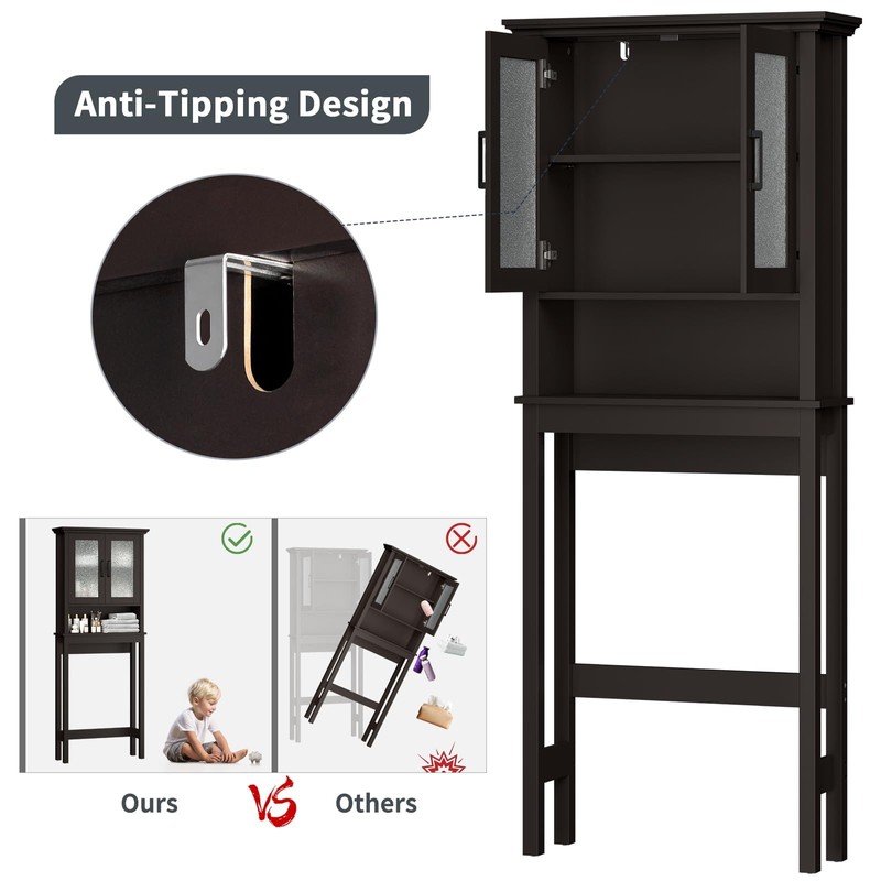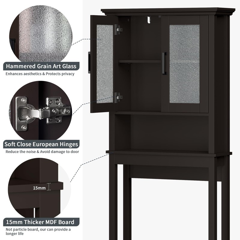- Sturdy & Stability - This over the toilet cabinet is made of MDF and hammered grain art glass, the craftsmanship of spray paint coating complements the simple tone of the shelf and cabinet, creating a transitional look. In addition, this behind the toilet organizer cabinet is equipped with anti-toppling accessories that enhance stability and secure your safety in daily use.