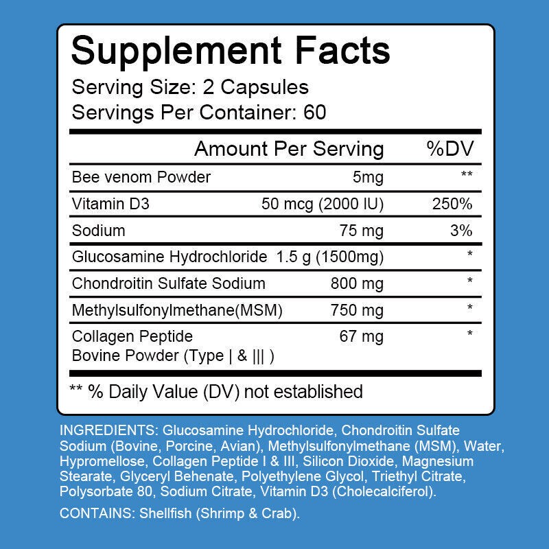 INGREDIENTS: Glucosamine Hydrochloride, Chondroitin Sulfate Sodium (Bovine,Porcine,Avian),Methylsulfonylmethane (MSM), Water,Hypromellose, Collagen Peptide l & IIl, Silicon Dioxide, Magnesium