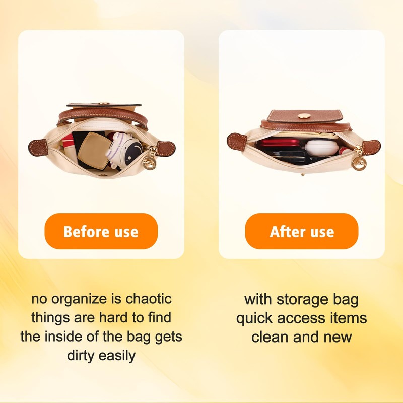 Handbag Storage Bag Organize Your Bag Easily revive your handbag, breathe new life into the bag, increase space, and say goodbye to clutter Hardware Zipper Closure Three-layer hardware electroplating, high-quality atmosphere, not easy to oxidize, not easy to break, long service life It can effectively and conveniently store, and protect the inner skin of the bag, shape the bag body, etc. Product Information Package Included: 1 x Tote Bag Organizer Insert, 1 x Adjustable Shoulder Strap Features: The Tote Bag Organizer Insert is made of high-quality felt material, which is sturdy enough to prevent the sides of the bag from collapsing and keep it structured. Made of high quality cowhide leather, the crossbody replacement bag strap is durable and flexible With multiple pockets to sort and organize your scattered items, allowing you to quickly and easily access the items you need. You can use it to sort and store small items or take it out to store wallets, books, etc. HASSLE-FREE INSTALLATION - 3 types of strap adapters No punching or modification required, just align the raised part with the groove position, wrap from bottom to top, and snap the buckle. The bag accessory attaches securely to your bag without causing damage. COMFORTABLE AND ADJUSTABLE With a width of 0.9cm/ 1.2cm/and an adjustable length of 100-120cm/39-47 inch. This women's strap is perfect for Longchamp bags, but can also be used for various shoulder bags, purses, and handbags. Elevate your style and improve the functionality of your favorite bags.