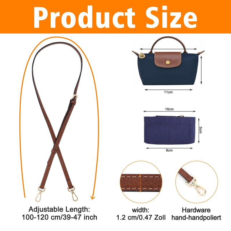 • Handbag Liner: The latest sizes are designed specifically for Longchamp bag inserts. Size Mini = 16*5*8cm cm (Length × Width × Height). Shoulder Straps The width is 1.2 cm/0.47 inches, the length can be adjusted to 100-120 cm/39-47 inches. Shoulder Straps for Bags Turn your handbag into an elegant shoulder bag or crossbody bag, creating a variety of carrying options.
