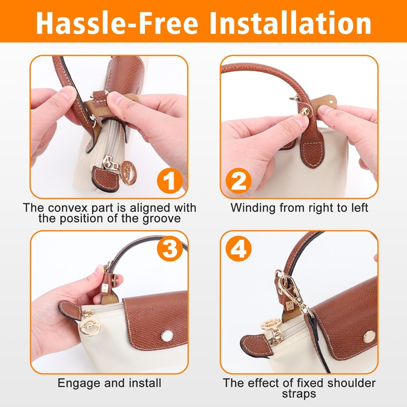 • Non-punching installation: No need for punching or modification. Just align the raised part with the groove position, wrap it from bottom to top, and then fasten the belt buckle. The purse accessory is securely attached to your bag and will not cause any damage.(Note: Make sure to follow the installation steps shown in the picture to avoid unnecessary trouble).