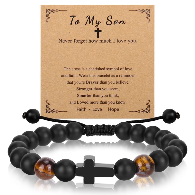 - [ EXCELLENT MATERIAL ] - This to my son bracelet from mom and dad is made of black frosted stone, tiger eye stone and cross in series, which is comfortable to touch, skin-friendly and wear-resistant, and you will not feel uncomfortable wearing it for a day. The internal nylon rope material is flexible and tightly woven, not easy to break.