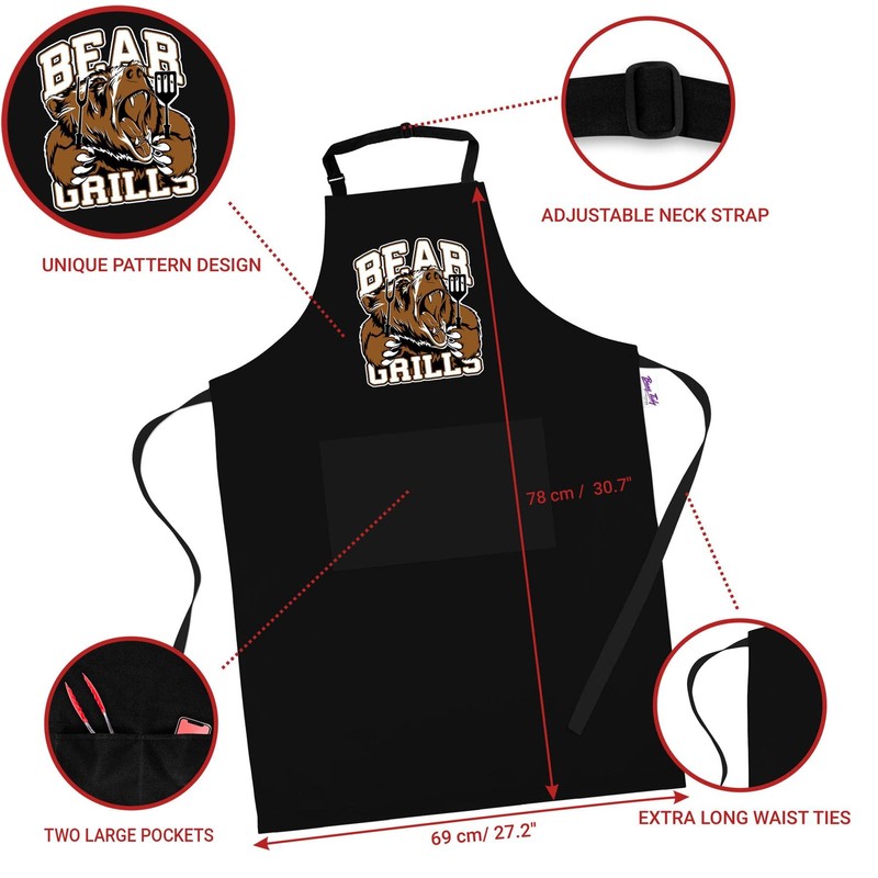 BBQ Aprons for Men, Funny Cooking BBQ Apron in 100% Cotton, Adjustable with 2 Pockets, Birthday, Christmas, Cooking Gifts for dad, chef, husband, him - Bear Grills - Black