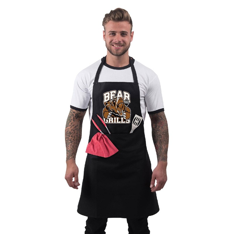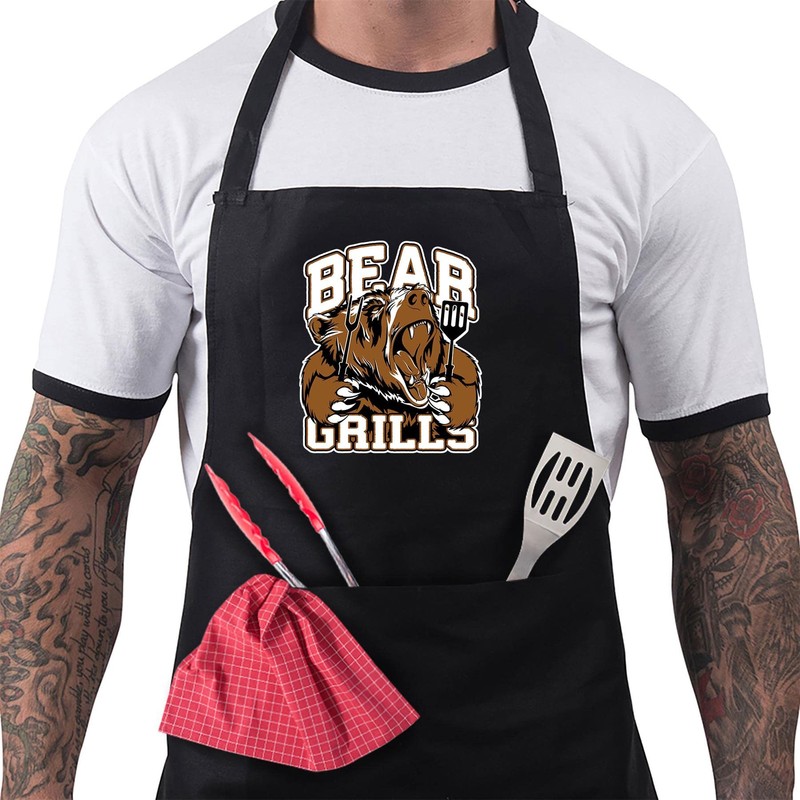 BBQ Aprons for Men, Funny Cooking BBQ Apron in 100% Cotton, Adjustable with 2 Pockets, Birthday, Christmas, Cooking Gifts for dad, chef, husband, him - Bear Grills - Black