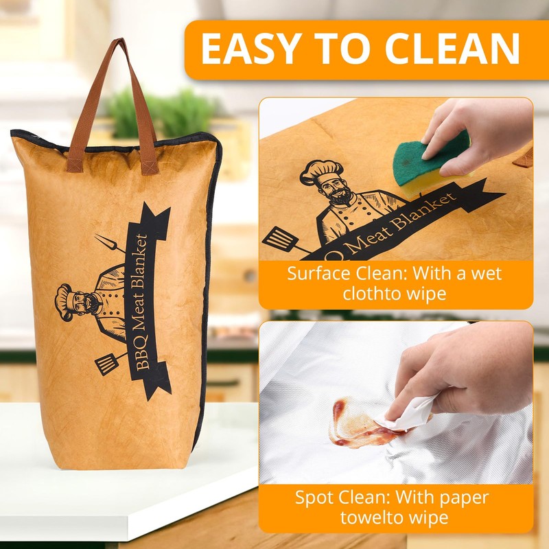 - EASY TO CLEAN: The BBQ Insulation Blanket is made of aluminum foil on the inside and DuPont paper on the outside, which has good water and oil resistance and is easy to clean. The barbecue warming blanket can be recycled, the surface is made of aluminum foil, just wipe it with a damp cloth to remove stains, or wash it with mild soap and water.