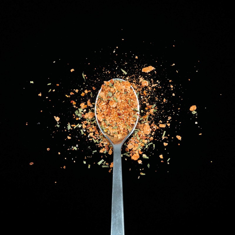 Ingredients: sea salt, spices (paprika, tomato, pepper, ginger, coriander, chili, fenugreek, turmeric), chives.