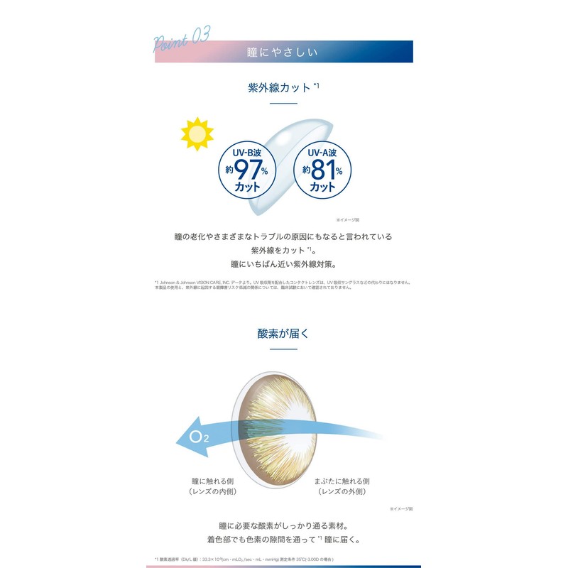 - ✅【UVカット】紫外線は目の老化やさまざまなトラブルの原因に。目に影響を及ぼすといわれる紫外線は、目には見えませんが、一年中、さまざまな角度から目に届いています。目に直接つけるコンタクトレンズなら、サングラスの隙間から入り込む紫外線もカット。「瞳にいちばん近い紫外線対策」です。目の健康に配慮して、アキュビュー のコンタクトレンズは、全製品UVカット。毎日の使用で大切な目を紫外線から守りましょう。