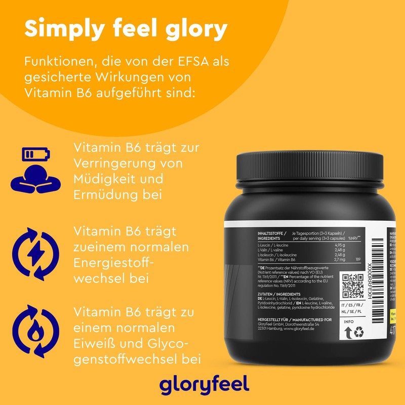- ✅German brand quality. Gloryfeel BCAA is made in Germany according to the highest quality standards and is subject to continuous tests by accredited independent testing labs. Included E-book: In addition, you will receive the e-book “BCAA - Branched Chain Amino Acids” with lots of background information on the product and all about the B-vitamin B6.