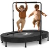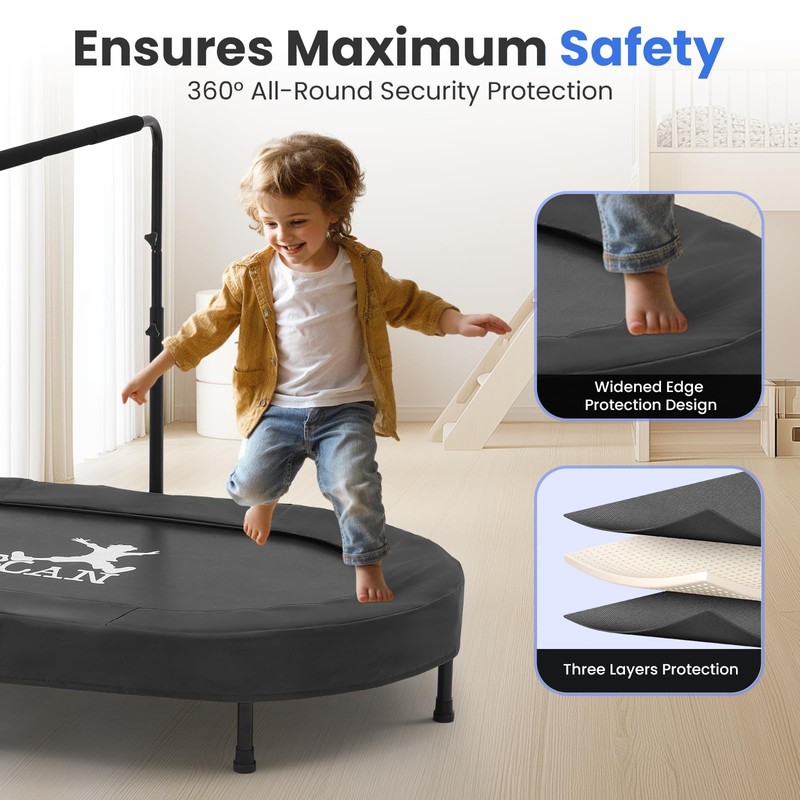 - Adjustable Handlebar: The handlebar with adjustment knob provides 5 heights ranging from 37.8 inches to 50 inches. This fitness trampoline is suitable for people of any age, such as babies, toddlers, children, teenagers and adults