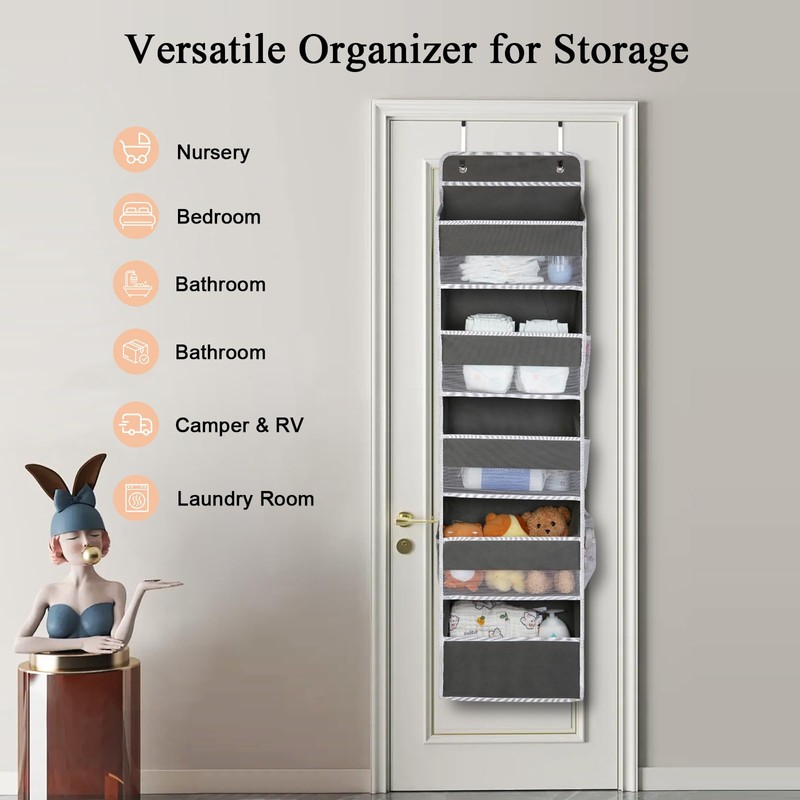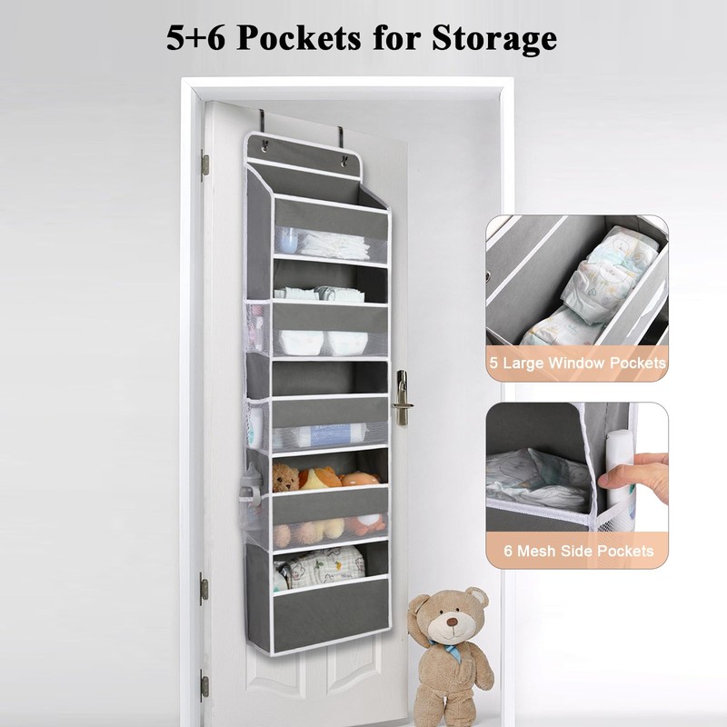 - NEW DESIGN WITH 5 LARGE CAPACITY POCKETS - Bchway Over Door Storage Organizer measures 52.36" x 14.17" x 5.9" (H x L x W). 5 roomy bins with increased spacing on each tier to 4.33 inches to fit more items in various sizes. The 6 deep side pockets for extra storage of clutter that has nowhere to go, keeping all baby essentials organized items such as diapers, wipes, toys, bibs, towels, socks, etc, making the baby room looks more clean.