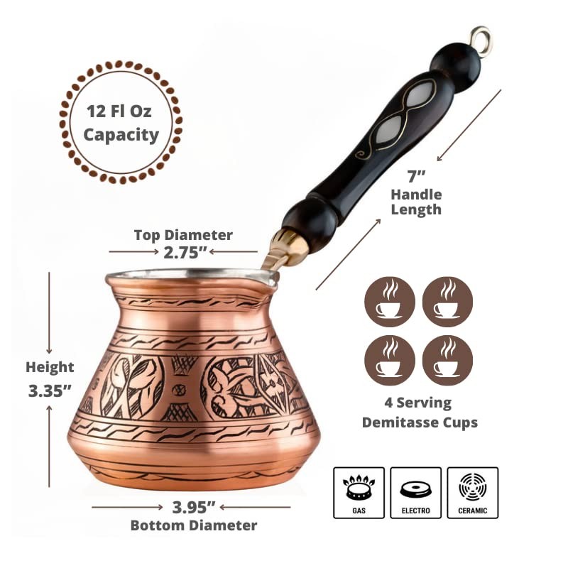 - Includes: Copper Turkish coffee pot and wooden spoon